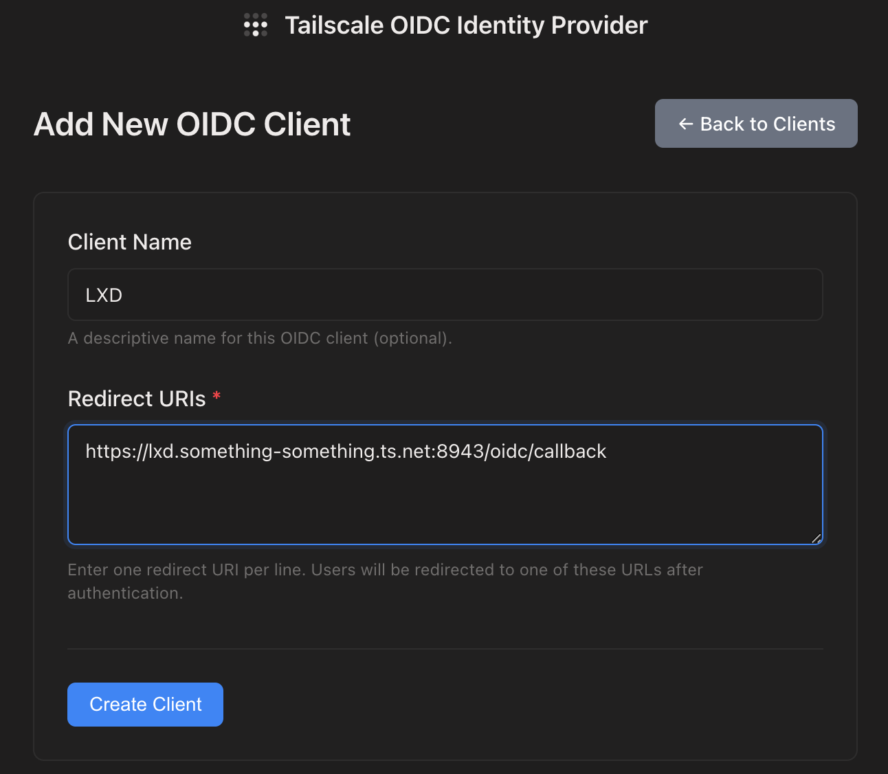 lxc config set oidc.client.secret=<as generated in tsidp>